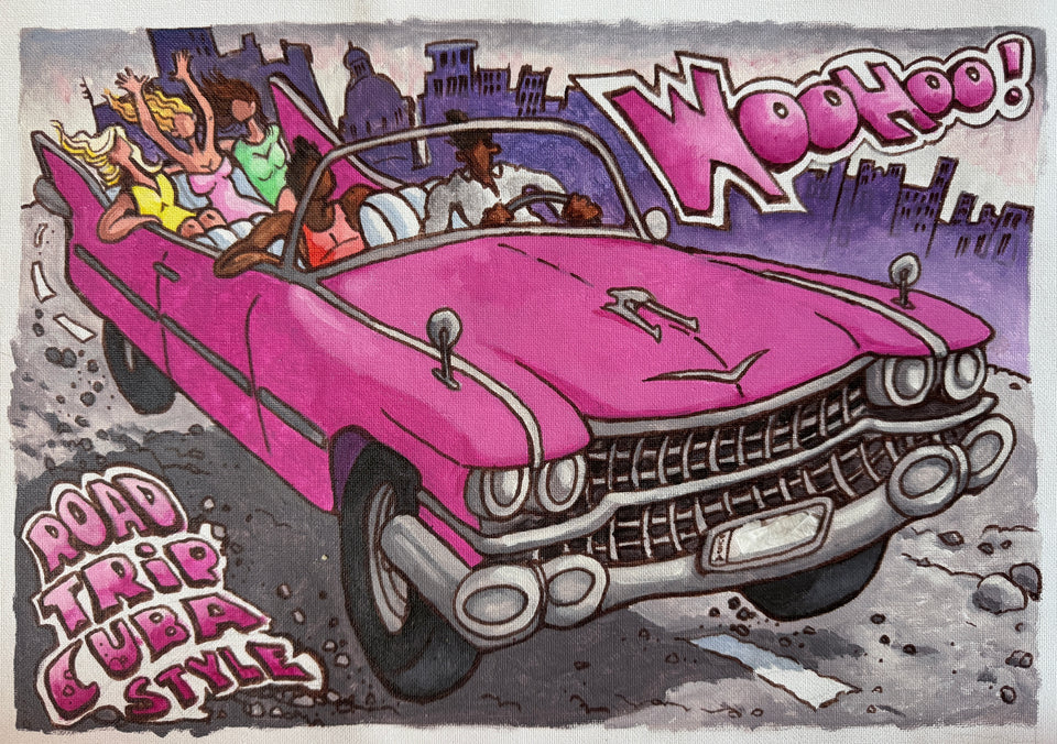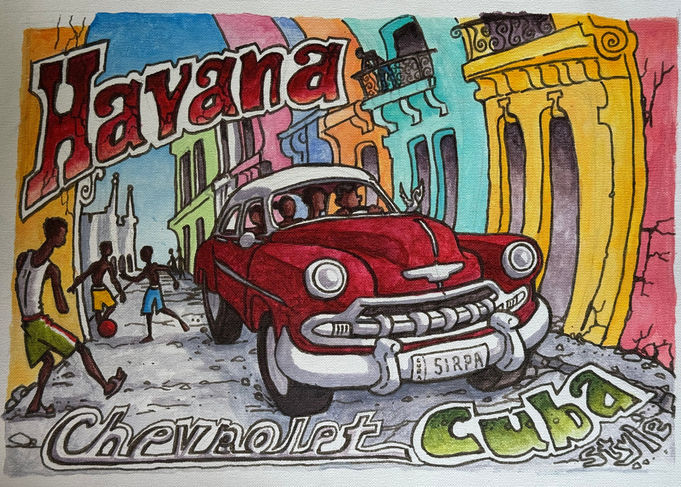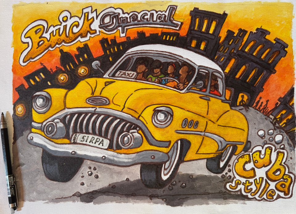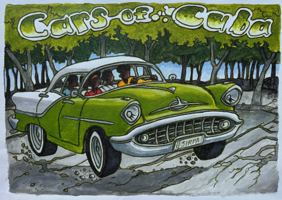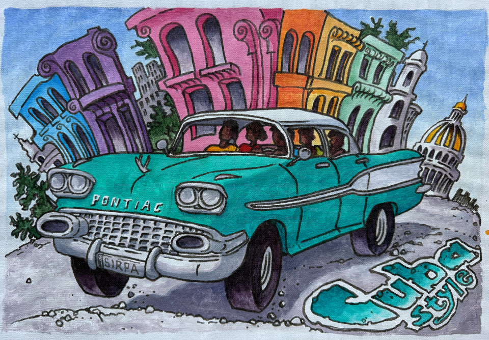 Little warm up work, a mini painting of an old Buick Special classic car in Cuba. 24 cm x 38 cm. ( 11” x 15”) The beauty of painting cars from Cuba is that the actual cars are so modified and have all sorts of mixed parts from other cars that the paintings don’t need to perfect. They can be little off and wonky too because it reflects perfectly the feeling of “happy-go-lucky”, just like it feels on the road in Cuba.